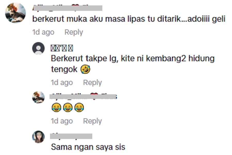 Nada yang sama dikongsi oleh netizen lain. “Dengan perasaan yang sama, muka aku terus berubah masa lipas itu ditarik keluar. Aduhai, geli yang tak terungkap.”