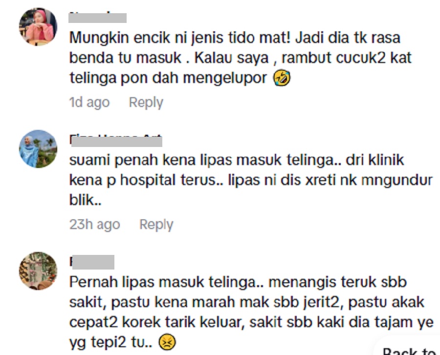 “Dengan rasa geli yang teramat sangat, aku tak boleh bayangkan lipas boleh masuk ke telinga. Muka aku terus berkerut melihat rakaman itu dan sampai sekarang rasa seram masih melekat,” komen salah seorang netizen.