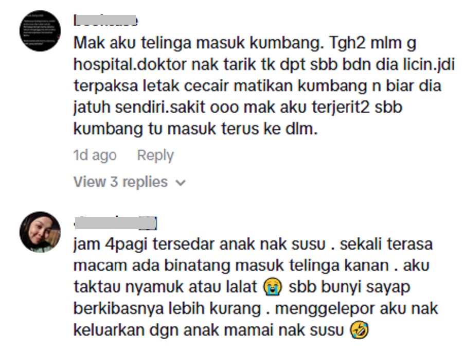 Manakala seorang netizen berkongsi pengalaman keluarganya, “Mak saya pernah telinga masuk kumbang. Tengah malam ke hospital.