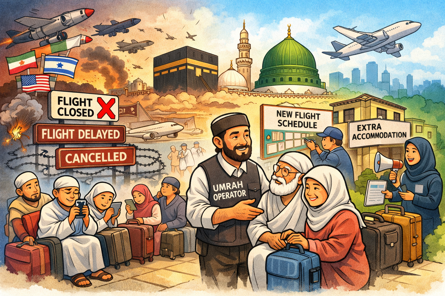 Ilustrasi krisis penerbangan umrah dan usaha pengendali menjaga kebajikan jemaah.