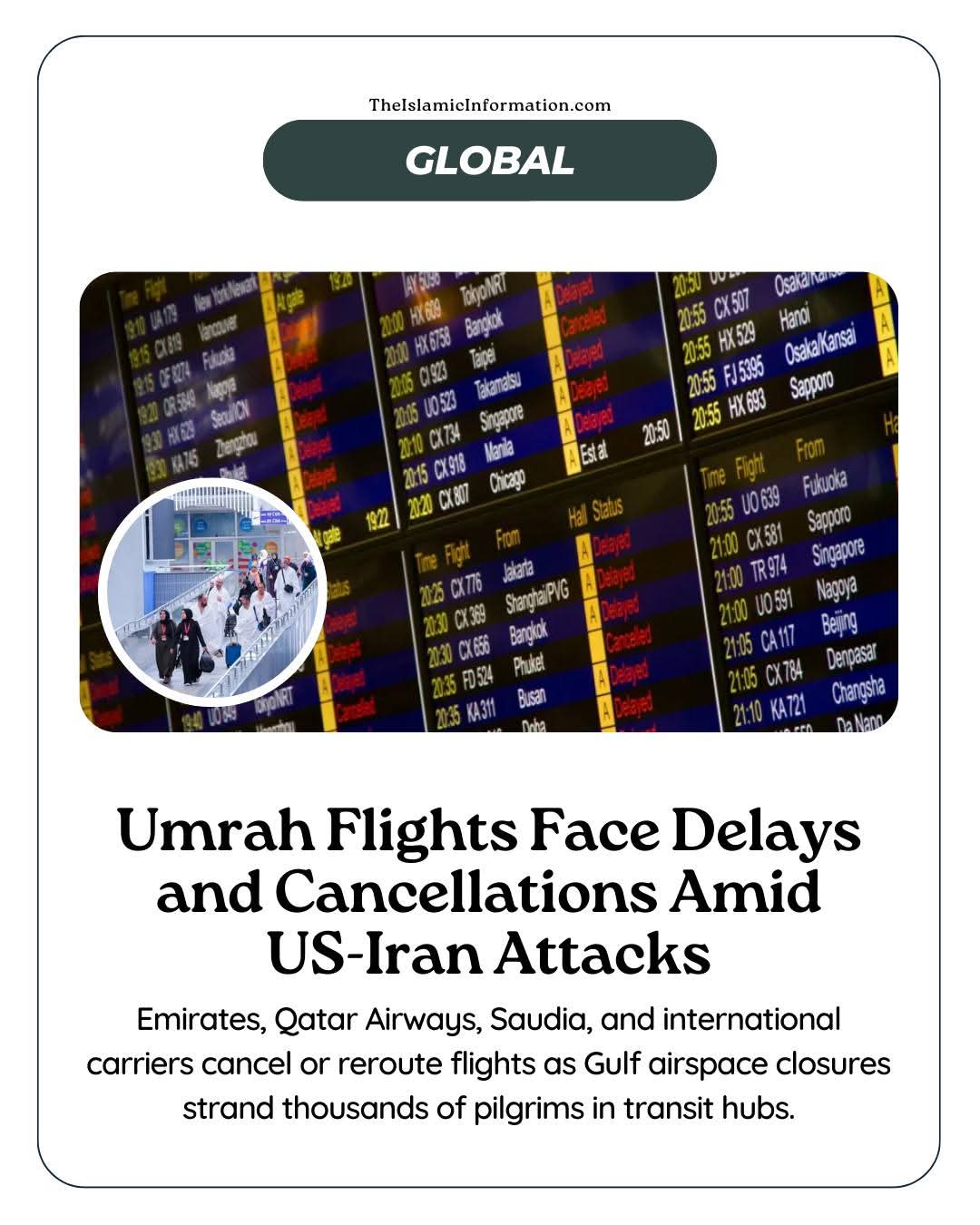 Situasi tersebut turut memberi kesan kepada sebahagian jemaah umrah dari pelbagai negara yang terpaksa menunggu lebih lama untuk pulang ke tanah air selepas menunaikan ibadah di Tanah Suci.