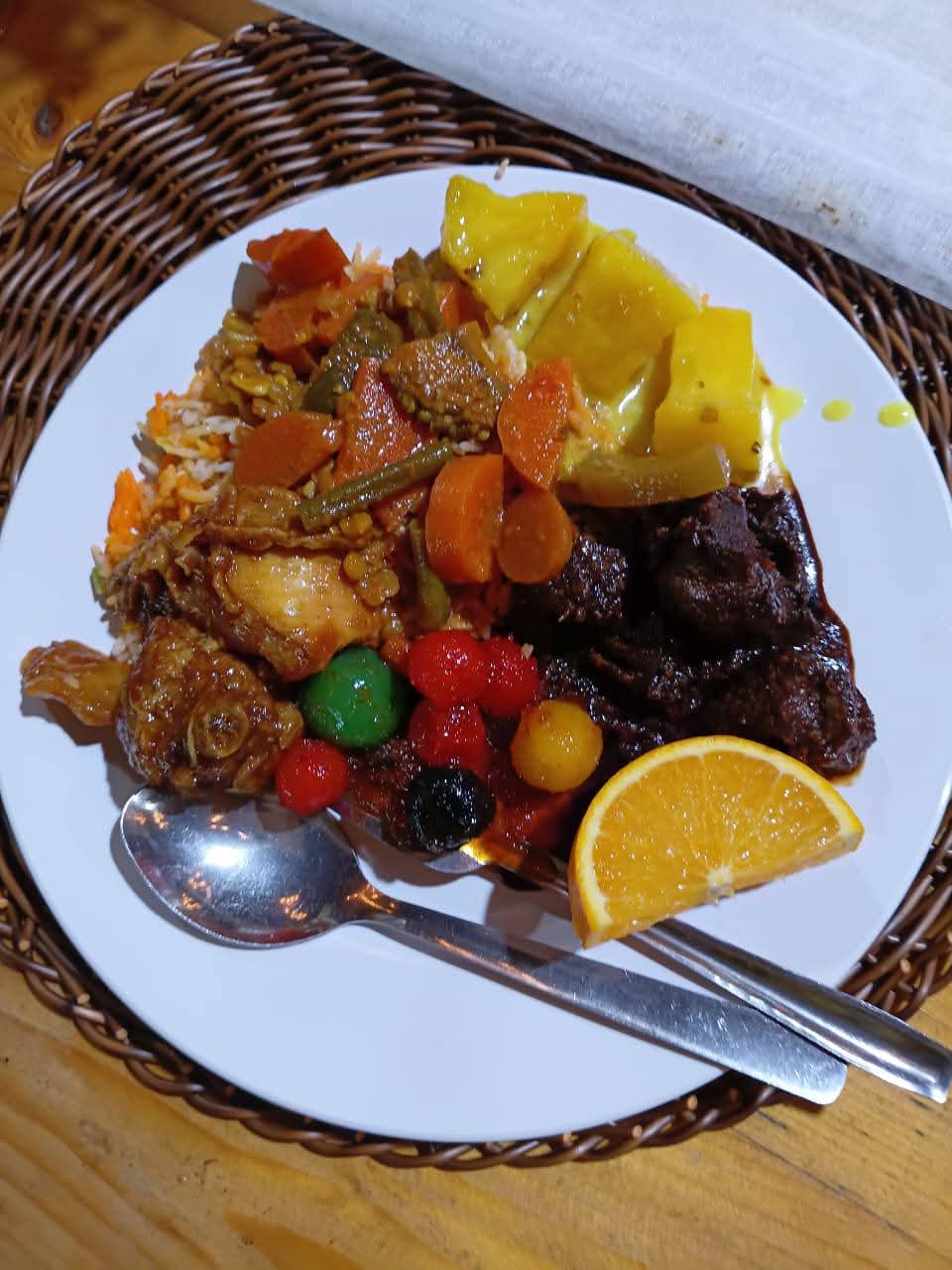 - Lauk Pauk: Ayam Masak Merah, Daging Masak Hitam, Gulai Kawah Daging + Tulang, Ikan Gelama Masin Goreng.
