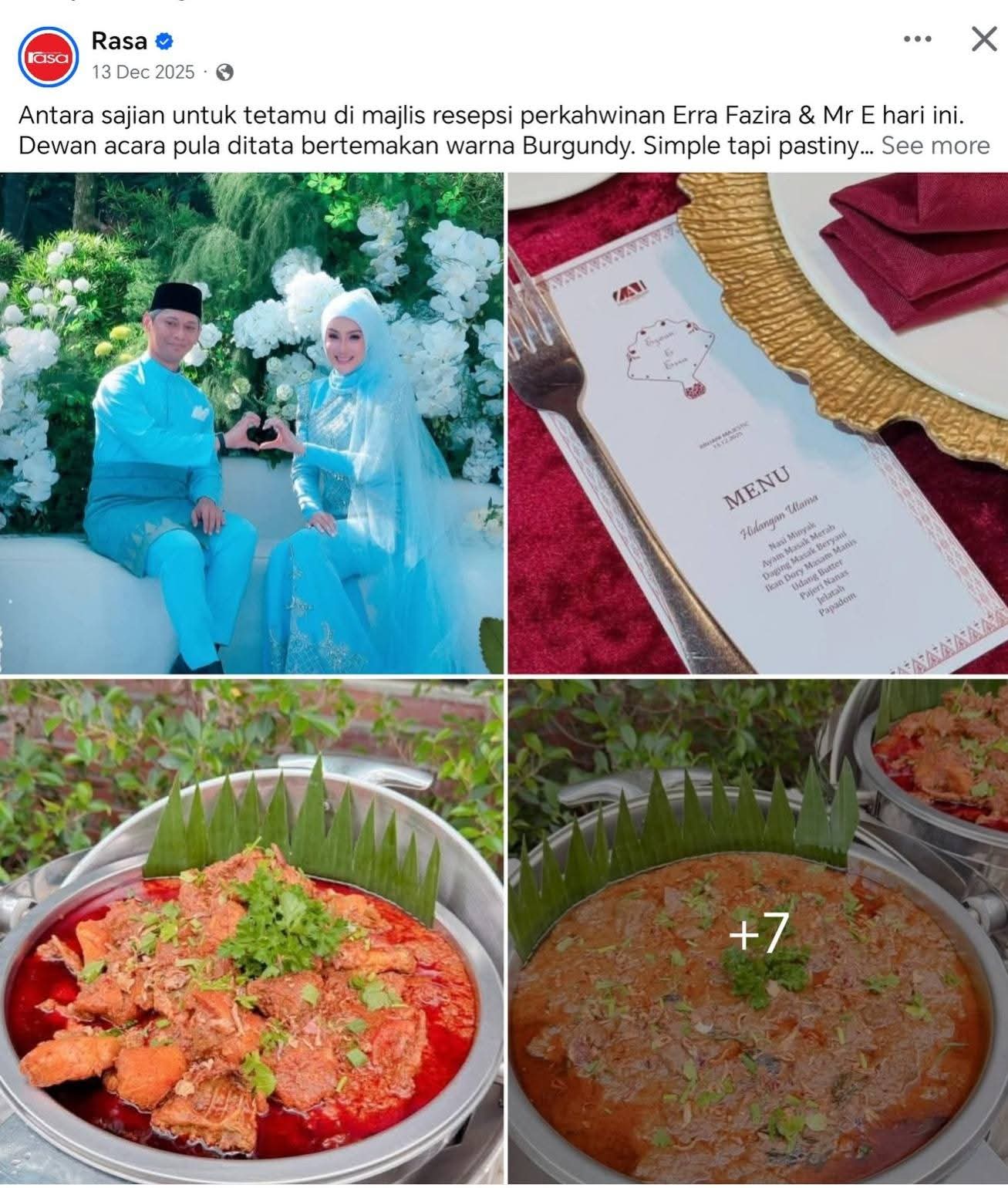 Nasi kenduri Erra Fazira (pada majlis resepsinya) menampilkan menu hidangan Melayu klasik seperti Nasi Beriani Basmathi, Ayam Masak Merah, Daging Masak Hitam, Gulai Kawah Daging & Tulang, serta pelbagai kuih muih, cendol, dan hidangan istimewa seperti Siakap 3 Rasa dan Ayam Golek Black Pepper untuk majlis santai, menunjukkan perincian menu yang meriah dan tradisional.
