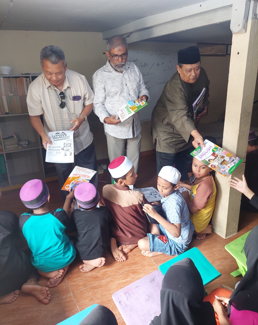 Abdullah Mohamed Nor (kiri) bersama Rafiq Ali Mutalib (tengah) dan Ismail Aruf menyampaikan sumbangan termasuk buku semasa turun padang ke asrama pelajar terbabit.