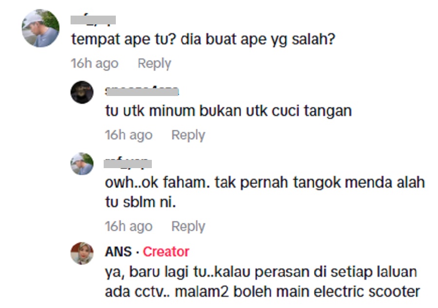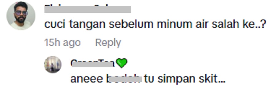 Antara komen yang menarik perhatian datang daripada pengguna TikTok yang menulis, “Tu untuk minum, bukan untuk cuci tangan.”