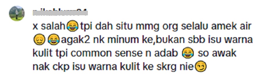 “Tak salah nak ambil air, tapi dah situ memang orang selalu isi untuk minum. Bukan isu warna kulit, tapi common sense dan adab,” tegasnya.