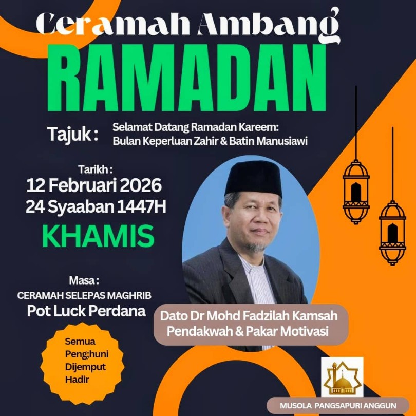 "Ayuh, umat Islam, kita membetulkan cara fikir terhadap ibadah puasa supaya Ramadan menjadi medan peningkatan darjat, bukan alasan bermalas-malasan," kata pendakwah dan pakar motivasi terkenal, Datuk Dr Mohd Fadzilah Kamsah ketika menyampaikan ceramah Ambang Ramadan di Musolla Pangsapuri Anggun, Seksyen 4, Bandar Baru Bangi, Selangori.
