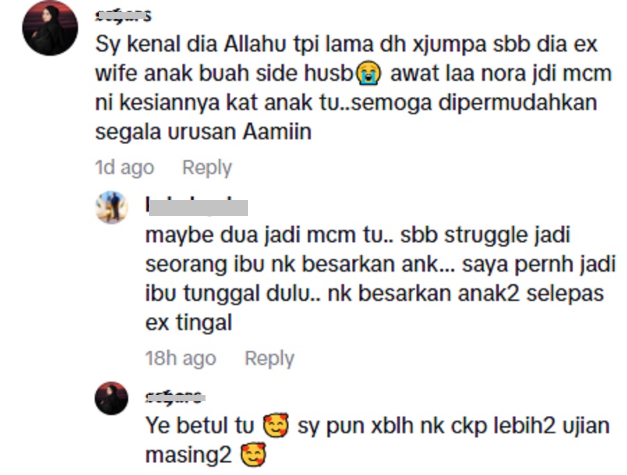 “Saya kenal dia. Allahu tapi lama dah tak jumpa sebab dia bekas isteri anak buah sebelah suami. Kenapa Nora jadi macam ni? Kasihan kat anak tu. Semoga dipermudah segala urusan. Amin,” dakwa salah seorang netizen.