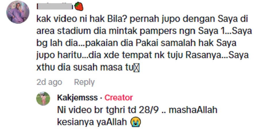 “Kak video ni bila? Pernah jumpa dengan saya di kawasan stadium. Dia mintak pampers dengan saya satu. Saya bagilah dia. Pakaian dia pakai samalah dengan saya jumpa hari tu. Dia tiada tempat nak tuju rasanya. Saya tak tahu dia susah masa tu,” cerita seorang lagi netizen.