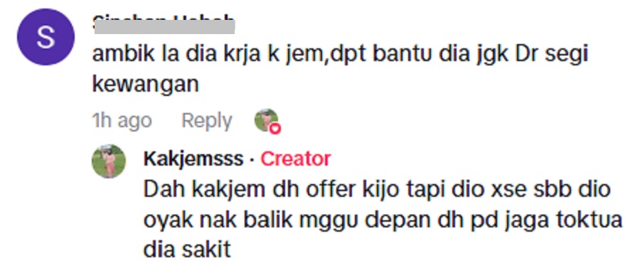 Kak Jem. Dapat bantu dia juga dari segi kewangan,” saran netizen tersebut.