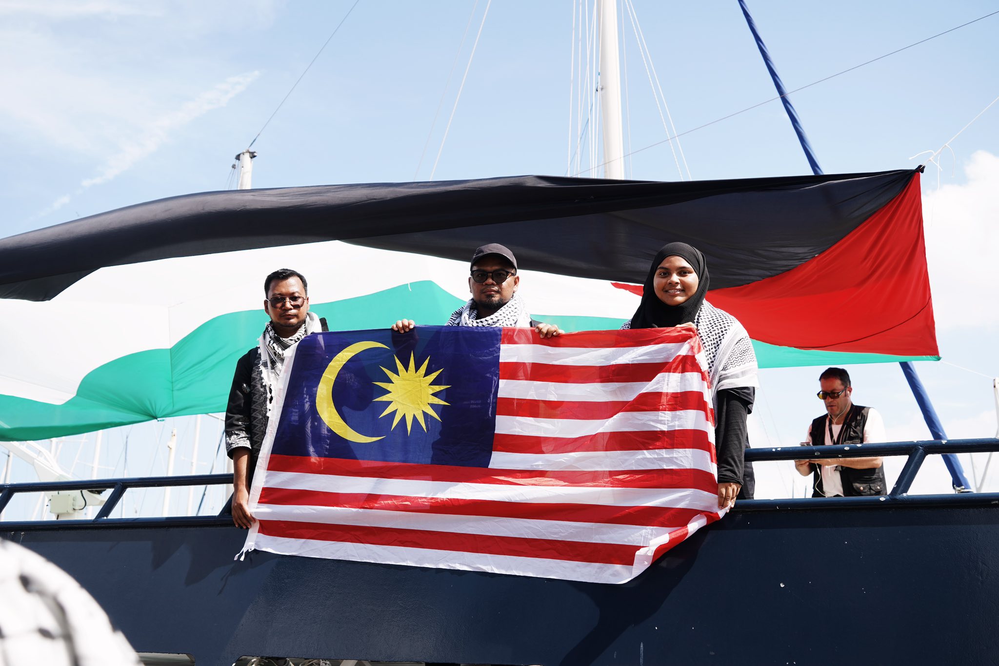 Perwakilan Malaysia dari kumpulan Sumud Nusantara memegang Jalur Gemilang. - Kredit foto: FB Sumud Nusantara Official