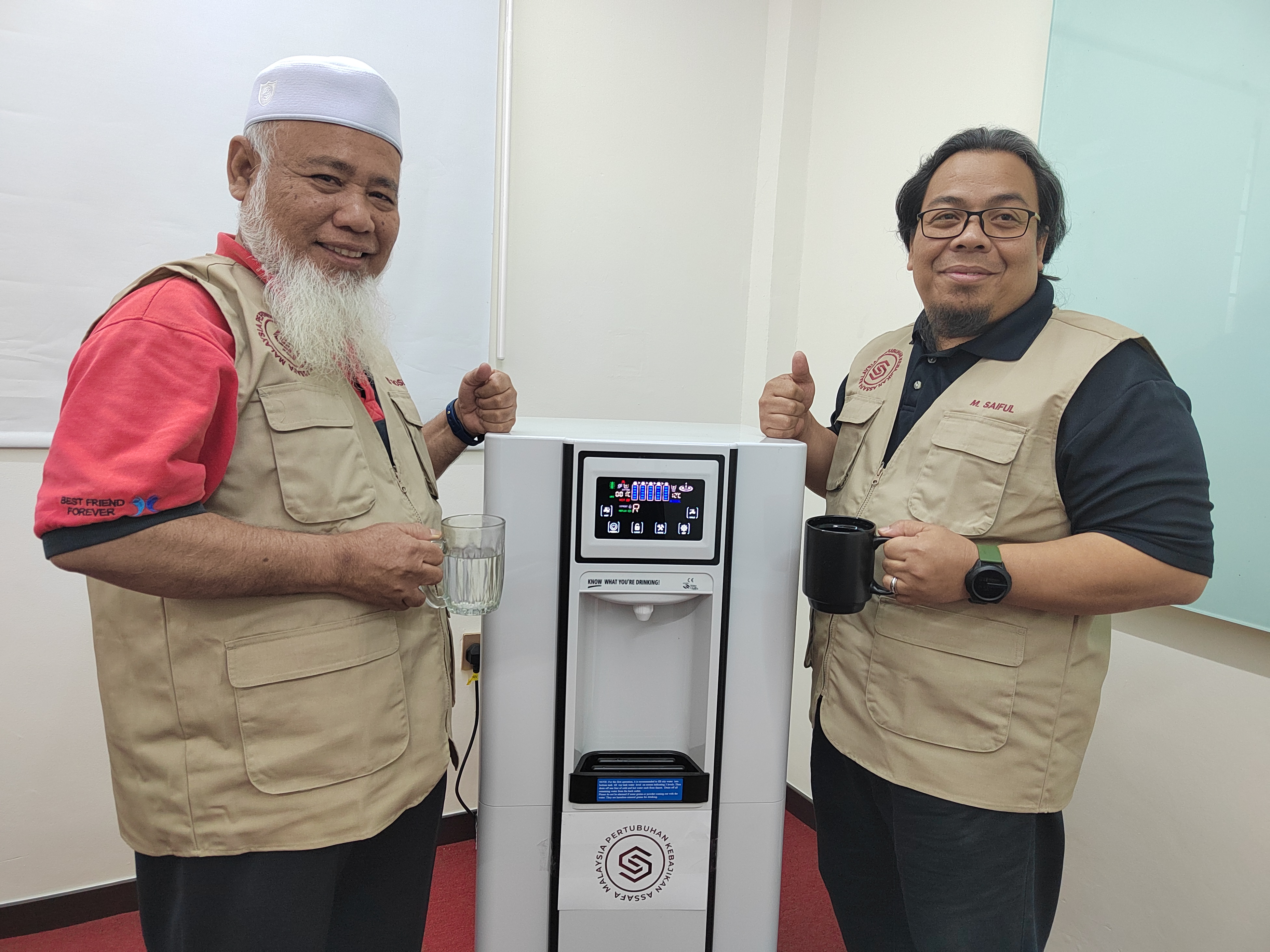 “Mesin ini bukan sekadar teknologi, ia adalah penyelamat. Kita tak perlu korek telaga atau tunggu bantuan lori air. Sambung ke elektrik, dan air minuman terus mengalir keluar – panas atau sejuk,” katanya.