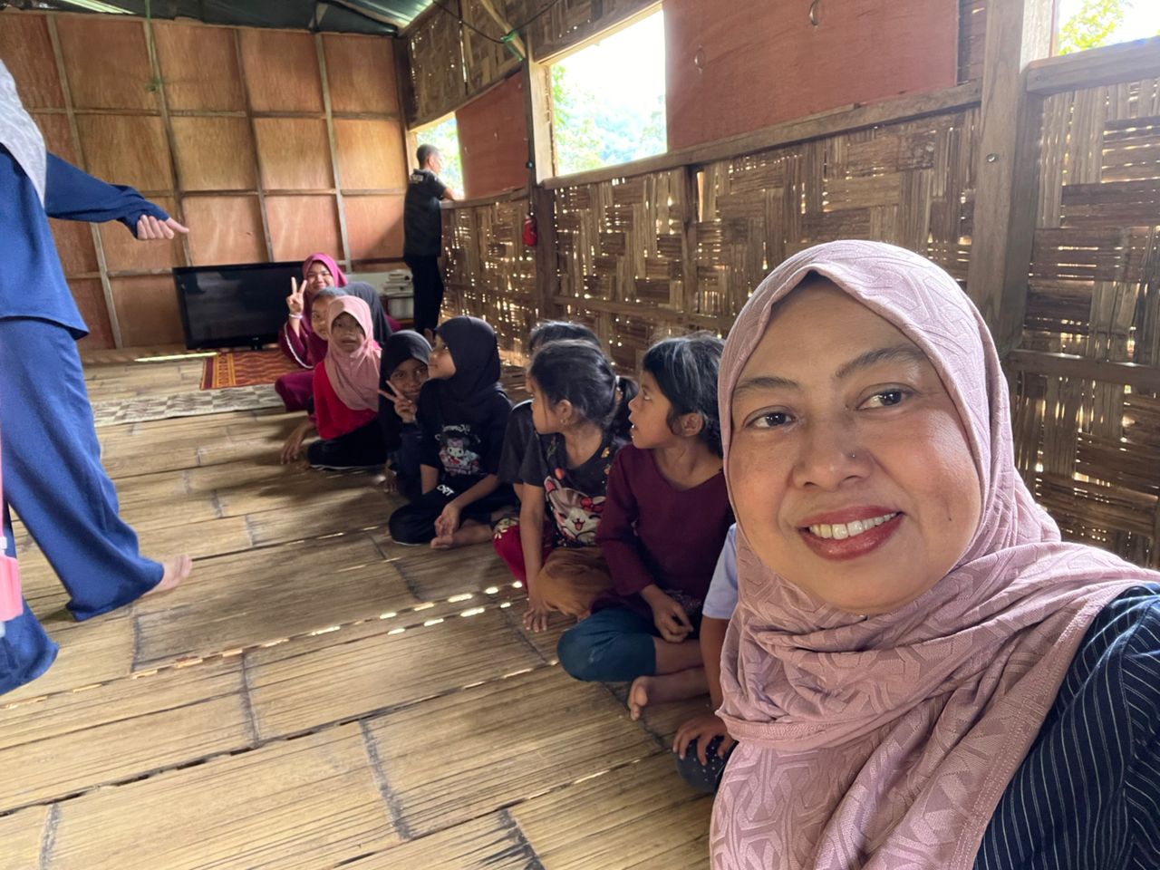 Zanahariah Jaafar berswafoto merakamkan anak Orang Asli mengikuti kelas membaca.