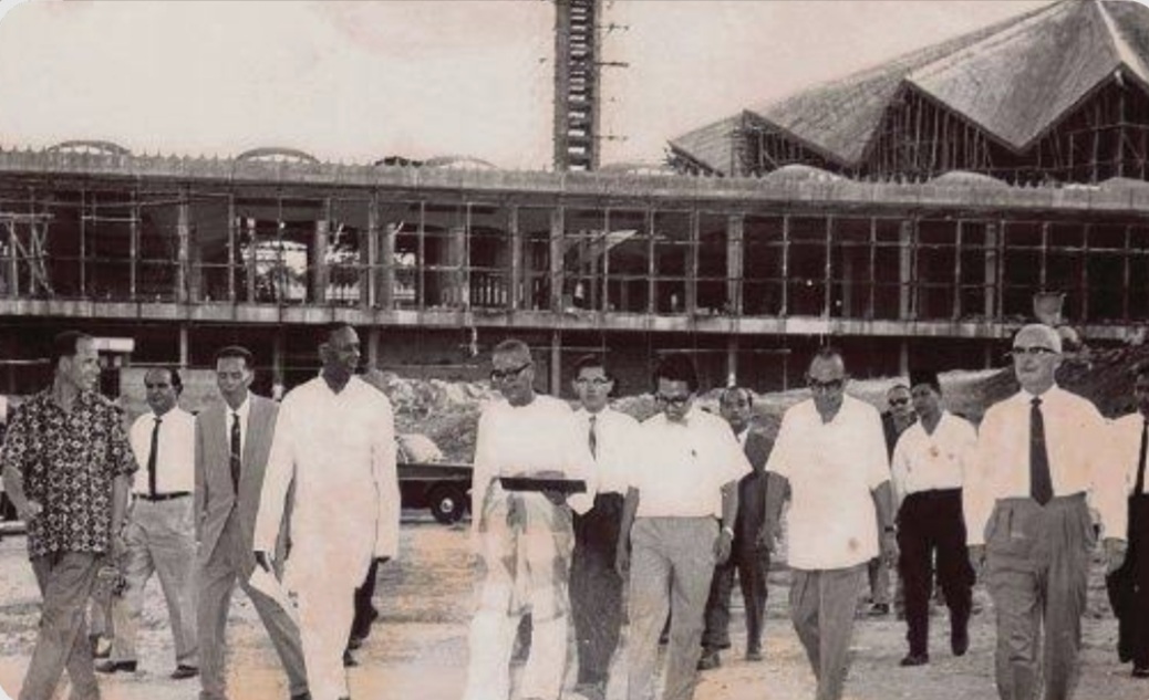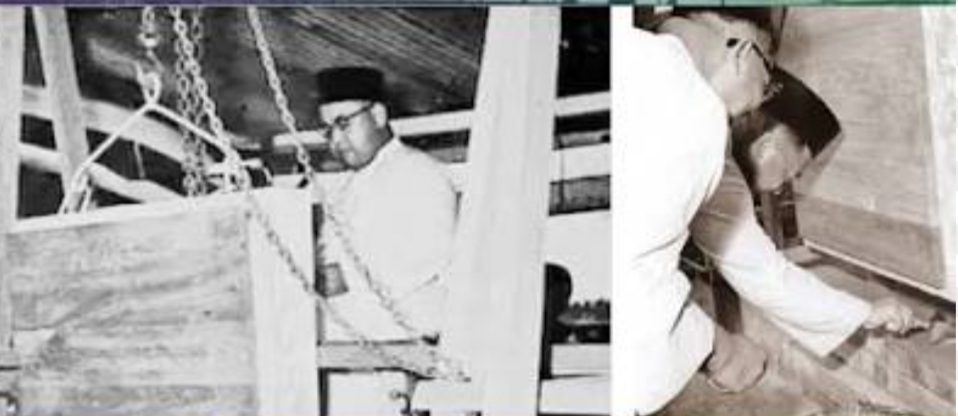 Tunku Abdul Rahman (berbaju Melayu bersamping) melawat tapak pembinaan Masjid Negara. Turut kelihatan Tun Abdul Razak (depan, dua dari kanan).