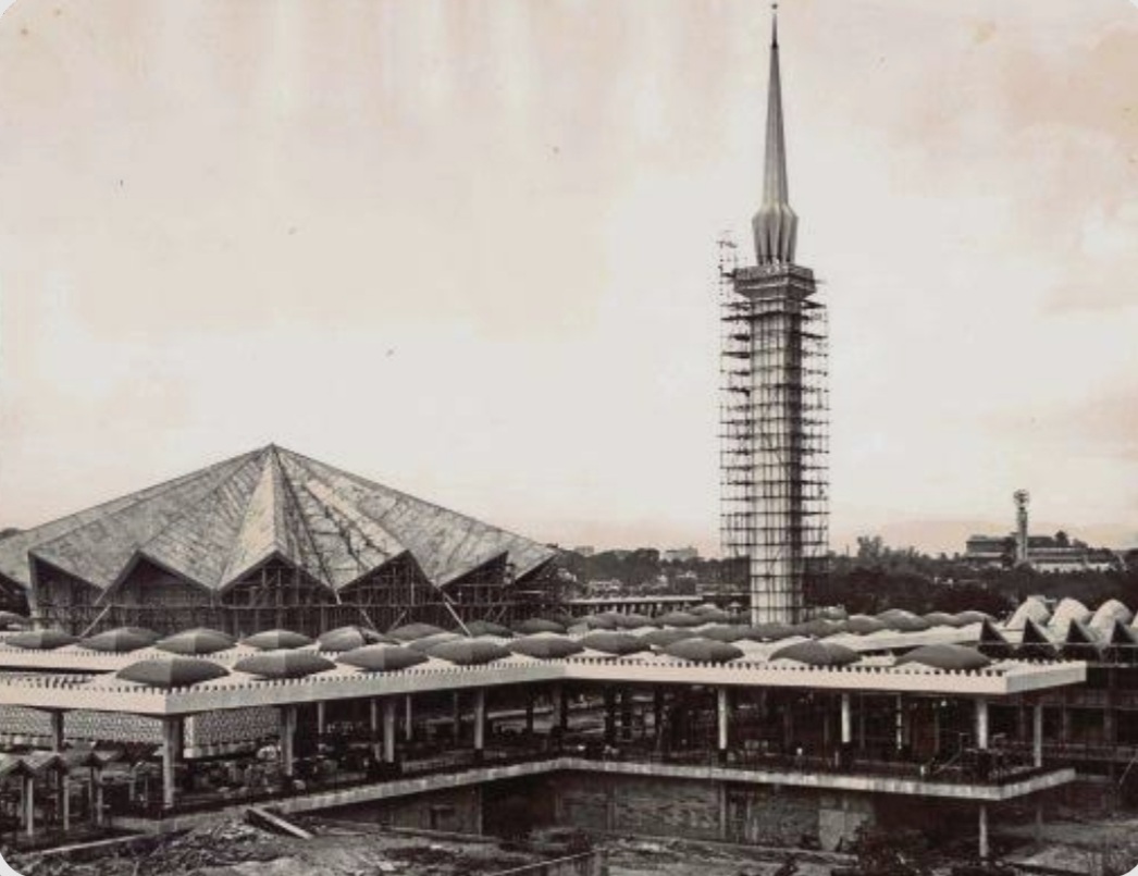 Masjid Negara berkonsep payung terbuka dan menara payung menguncup ketika dalam pembinaan.