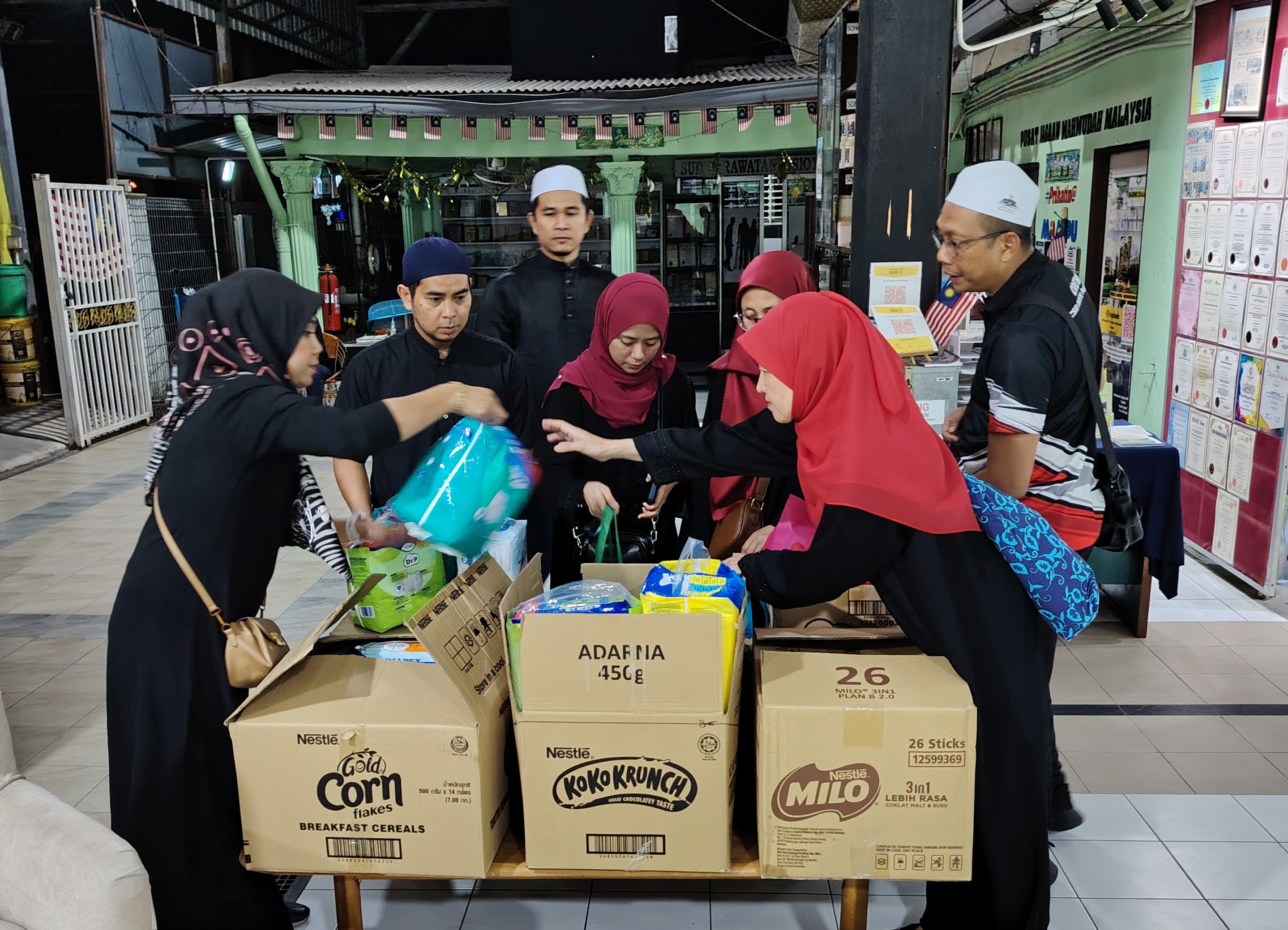 Ahli dan sukarelawan KESUS memeriksa barangan asas keperluan harian yang disumbangkan kepada PJMM.
