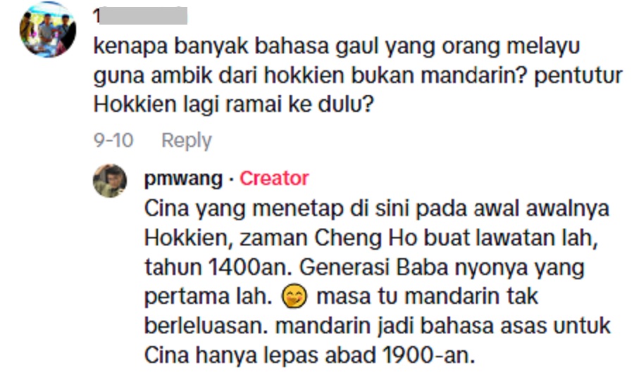 dia bertanya, “Kenapa banyak bahasa gaul orang Melayu ambil dari Hokkien, bukan