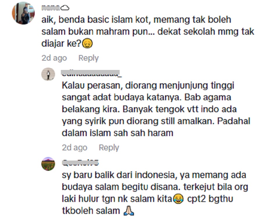 “Aik, benda asas Islam kot. Memang tak boleh salam bukan mahram pun. Di sekolah memang tak diajar ke?” tanya salah seorang netizen.