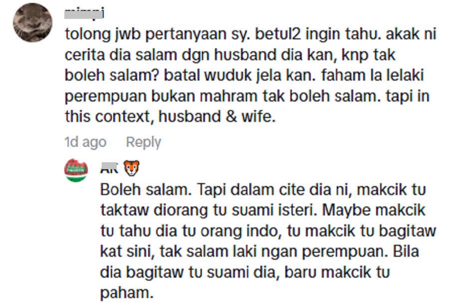 “Tolong jawab pertanyaan saya, betul-betul ingin tahu. Akak ni cerita dia salam dengan suami dia kan. Kenapa tak boleh salam? Batal wuduk jela kan.