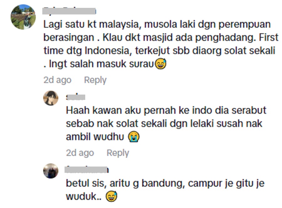 Manakala ada netizen turut berkongsi pengalaman ketika berkunjung ke Indonesia. Menurutnya, dia terkejut kerana surau di sana bercampur antara lelaki dan perempuan.
