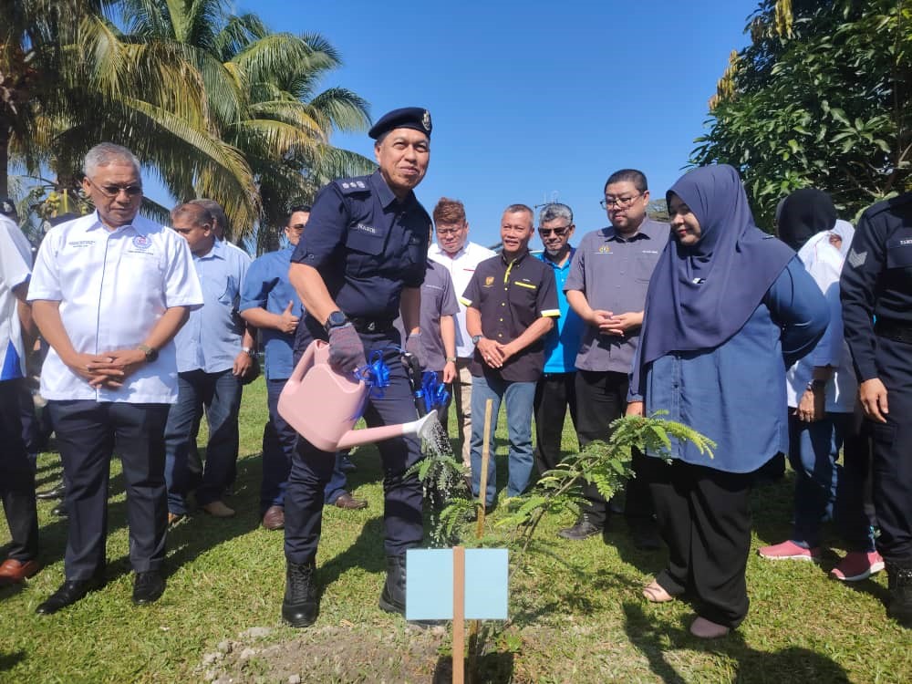 Mohd Nasir Ismail menyiram air ke pokok yang ditanam pada Program Hari Bertemu Pelanggan dan High Profile Policing di Balai Polis Pokok Asam, Taiping.