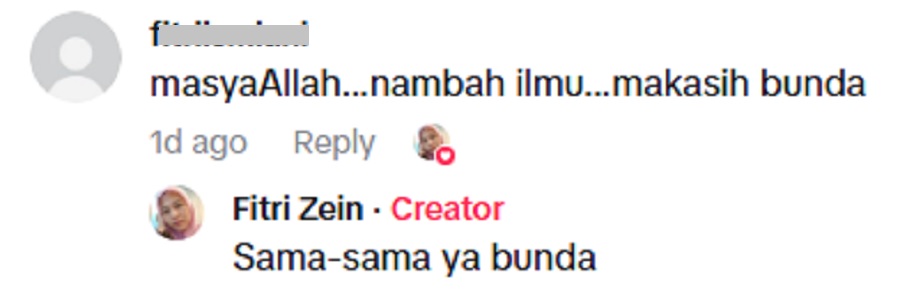 Antara komen yang mencuri perhatian ialah daripada netizen ini, “Masya-Allah. Tambah ilmu, terima kasih bonda.”
