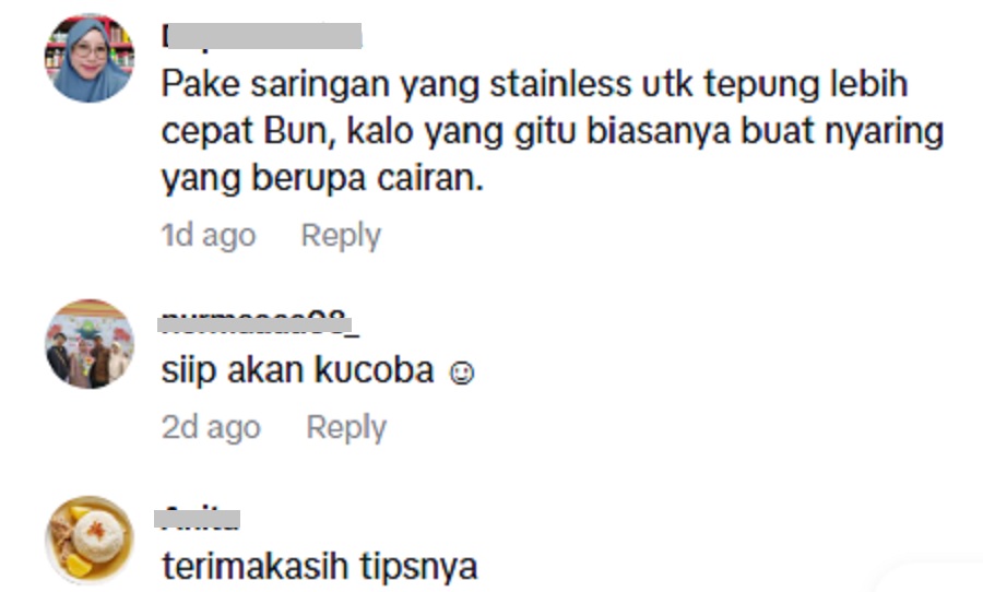 Ada juga yang memberikan pandangan tambahan atau petua lain. “Guna penapis stainless untuk tepung lebih cepat, sebab yang macam tu biasanya untuk tapis bahan cair,” kongsinya.