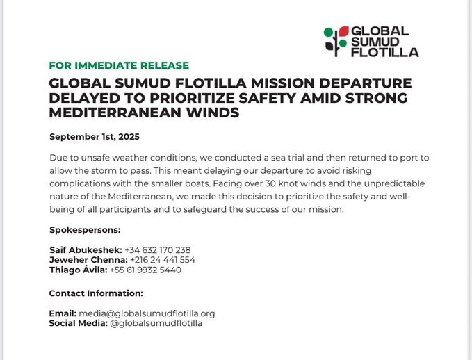 Kenyataan rasmi mengenai kelewatan pelepasan misi Global Sumud Flotilla 2025, berikutan angin kuat Mediterranean.