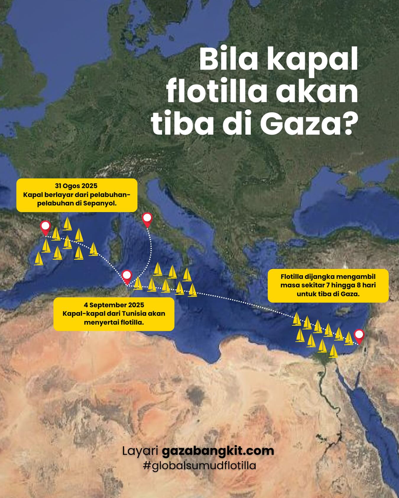 Pada 30 Ogos 2025, jawatankuasa antarabangsa untuk membebaskan Gaza daripada sekatan pada Sabtu lalu (30 Ogos 2025) mengumumkan bahawa `Global Sumud Flotilla` bakal memulakan pelayaran dari Barcelona pada ahad (31 Ogos 2025), diikuti pelayaran kedua dari Tunisia pada Khamis, 4 September 2025, bagi mencabar sekatan Israel ke atas wilayah Palestin.