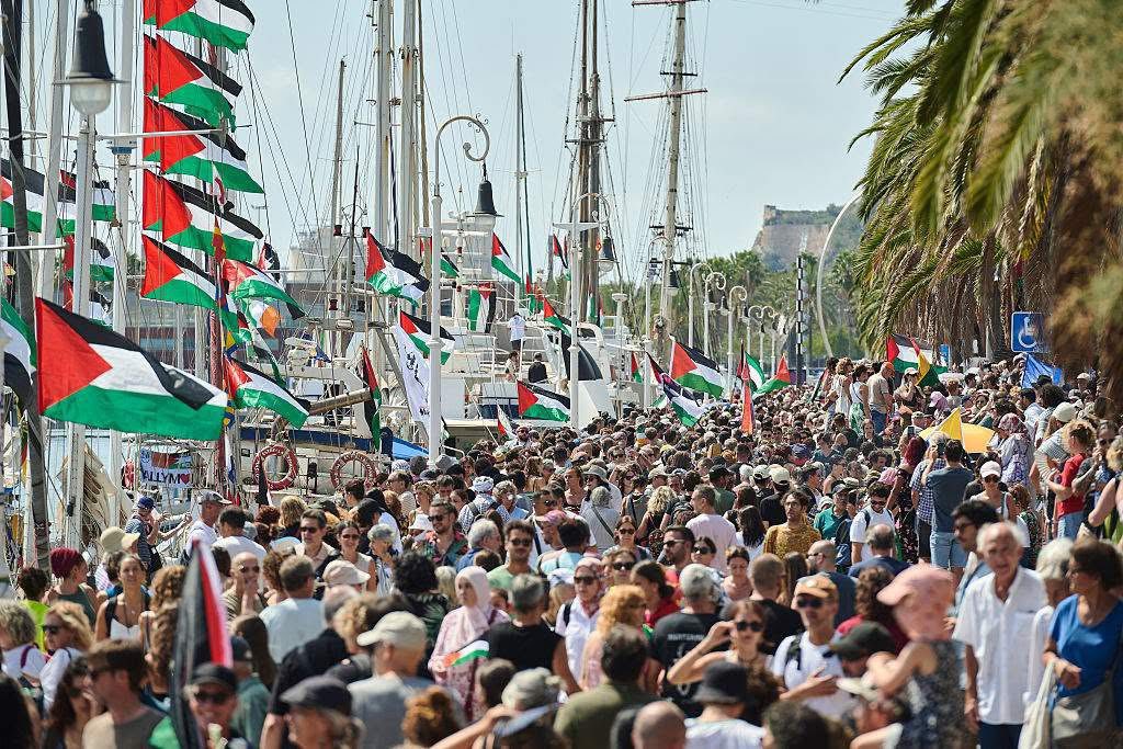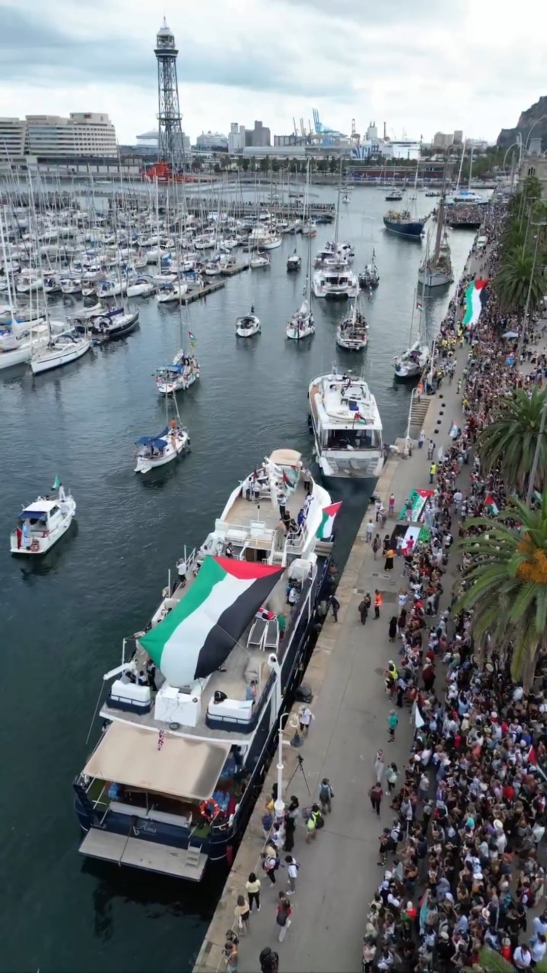 Lambaian daripada ribuan penyokong rakyat awam, saat pelepasan kapal misi Sumud Flotilla Global 2025 di Barcelona, Sepanyol.
