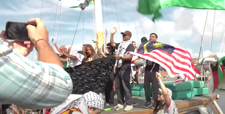 Peserta Malaysia mengibarkan Jalur Gemilang menjelang pelepasan kapal Sumud Nusantara dalam misi Sumud Flotilla Global 2025 . Kredit foto - Youtube Literal Idees & Ilibres Radicals