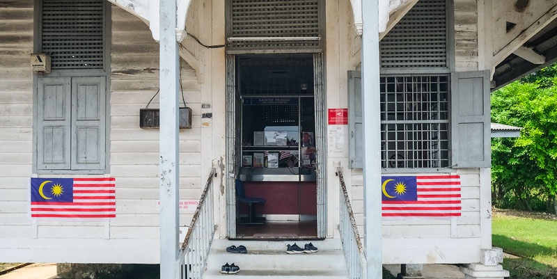 Melayu. Dengan bangunan papan bercat putih, Pejabat Pos Bukit Rotan nampak