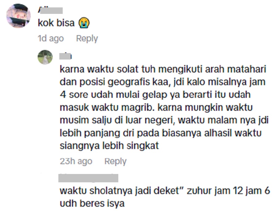 Ada seorang netizen memberikan penjelasan paling informatif apabila menerangkan bahawa waktu solat ditentukan oleh kedudukan matahari dan faktor geografi.