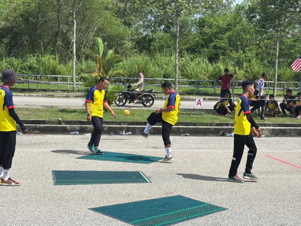 Pemain pasukan sepak raga tuju sedang beraksi dalam gelanggang semasa kejohanan itu berlangsung.