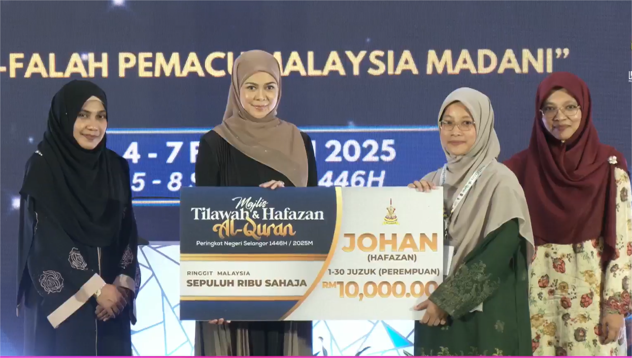 HUMAIROURROHMAH Mastar (dua dari kanan) menerima replika hadiah selaku Johan Hafazan Perempuan dan Peserta Terbaik Keseluruhan Hafazan daripada Tengku Norashikin Abdul Rahman.