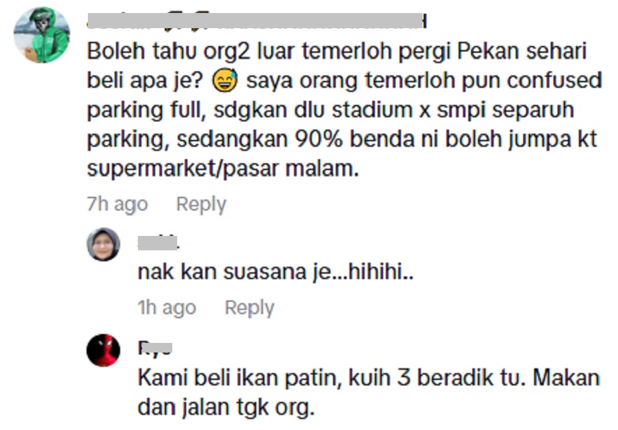 “Boleh tahu orang-orang luar Temerloh pergi pekan sehari beli apa je? Saya orang Temerloh pun keliru parking penuh, sedangkan dulu stadium tak sampai separuh parking.