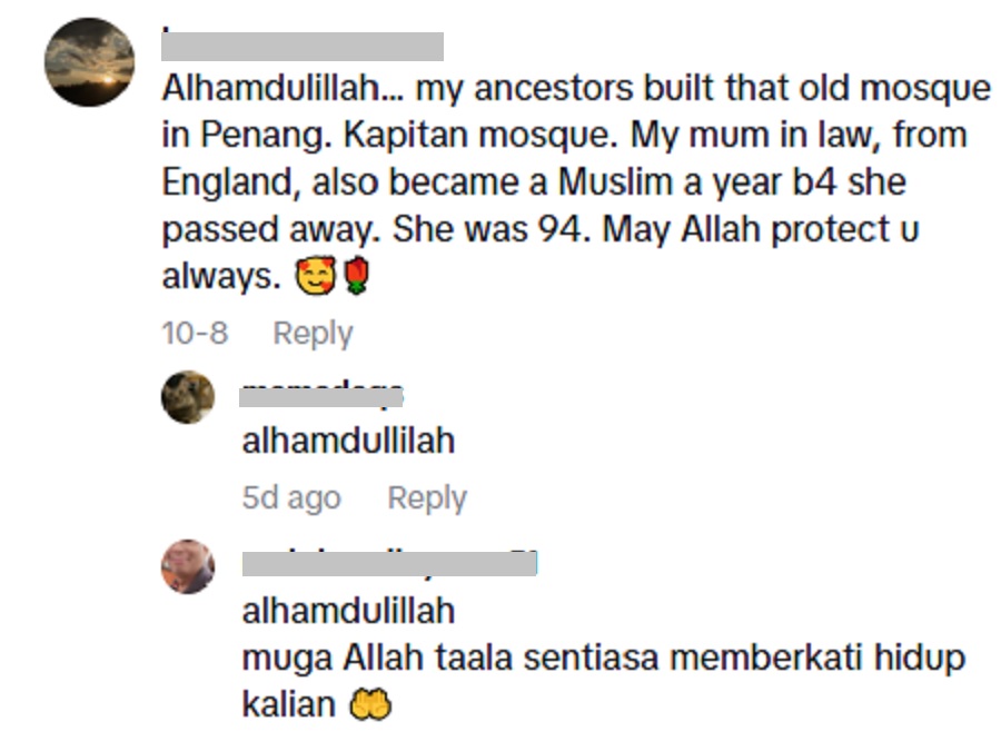 Antara komen yang menarik perhatian datang daripada seorang pengguna TikTok yang menulis: “Alhamdulillah, nenek moyang saya yang membina masjid lama di Pulau Pinang, Masjid Kapitan Keling.