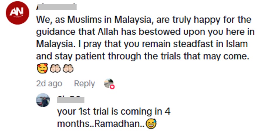 “Kami, sebagai umat Islam di Malaysia, amat bersyukur atas hidayah yang Allah kurniakan kepada anda di sini. Saya berdoa agar anda terus teguh dalam Islam dan sentiasa bersabar menghadapi setiap ujian yang datang,” tulis seorang lagi netizen.