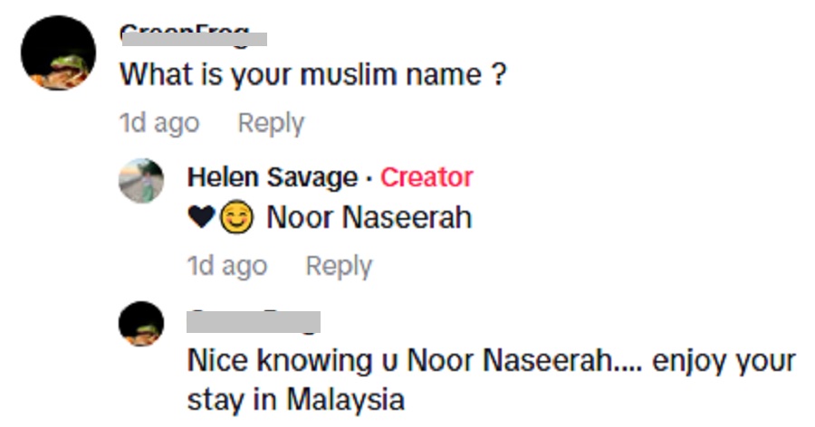 Dalam ruangan komen, Helen mendedahkan nama Islamnya, Noor Naseerah, sambil menjawab pertanyaan seorang pengguna mengenai identiti baharunya selepas memeluk Islam.