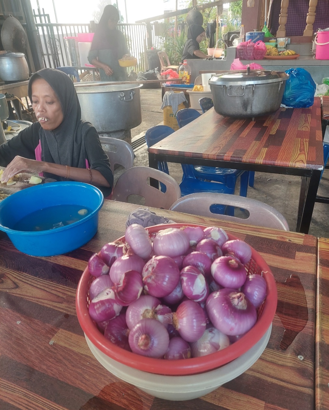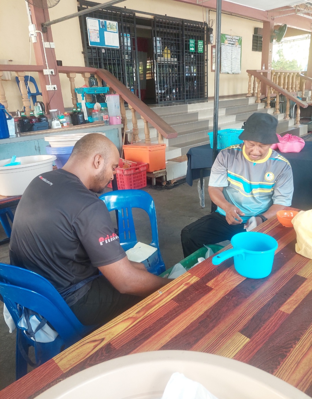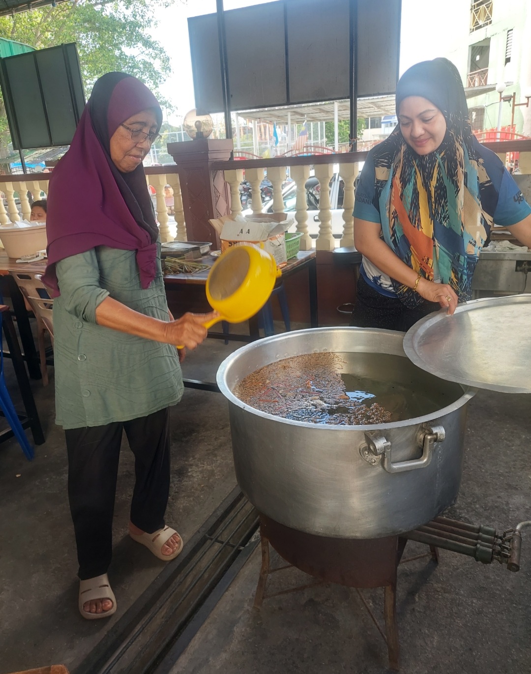 Pelajar mahupun para ibu tetap ringan tangan membantu dengan menyediakan bahan masakan serta kawah besar supaya bubur lambuk yang di masak mampu diagihkan selepas solat asar seperti lumrahnya selain untuk berbuka puasa. -