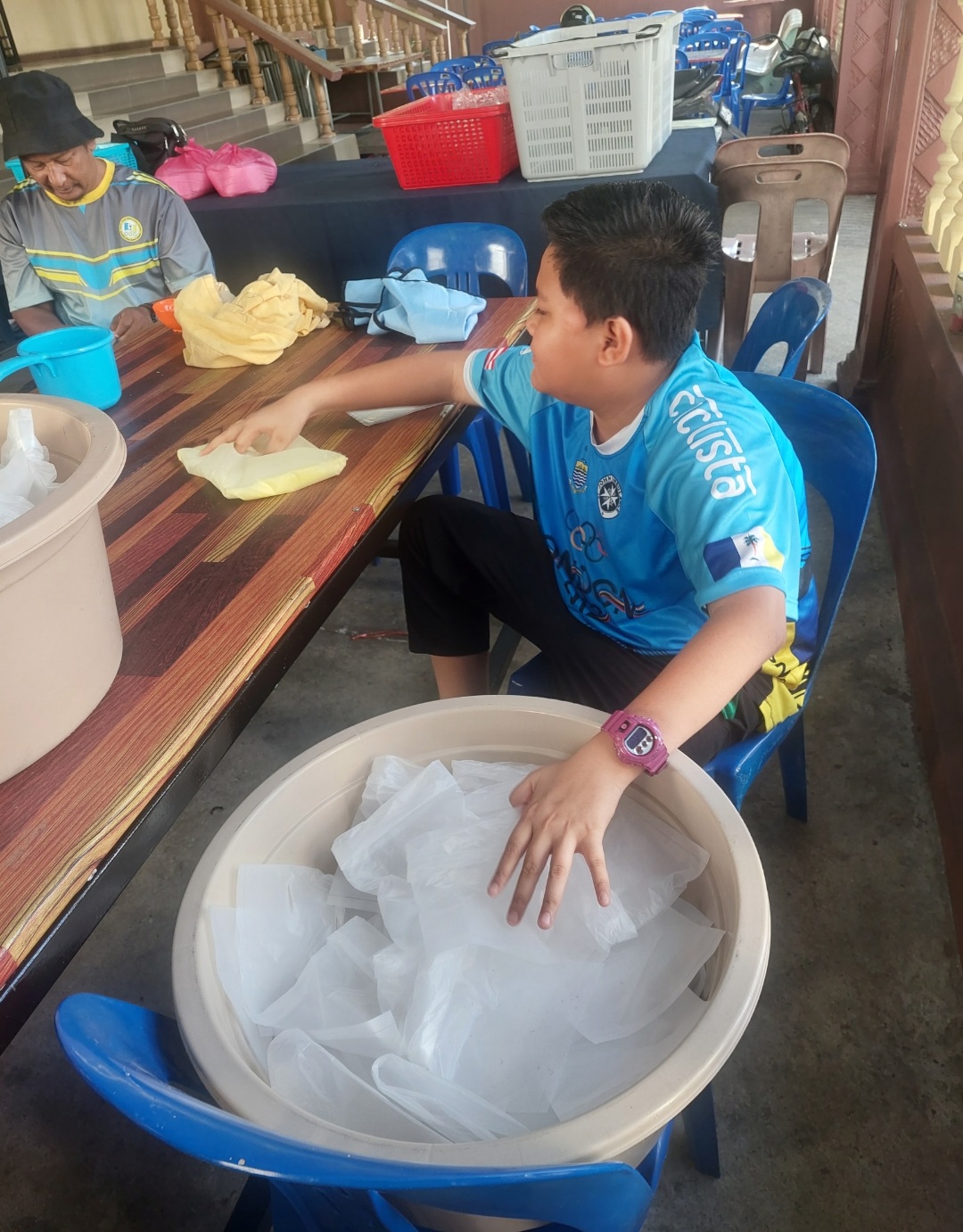 Sementara itu, penyediaan bungkusan bubur lambuk melibatkan segenap lapis masyarakat termasuk pelajar-pelajar yang mengambil bahagian bagi memastikan proses penyediaan berjalan lancar.