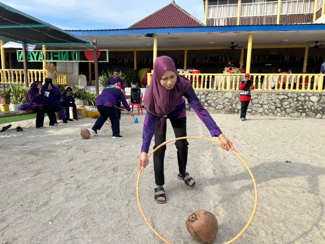 Petugas PJNH, Aidah Jamaat bersama warga emas terbabit dalam aktiviti sukaneka gelek buah kelapa menggunakan gelang rotan.