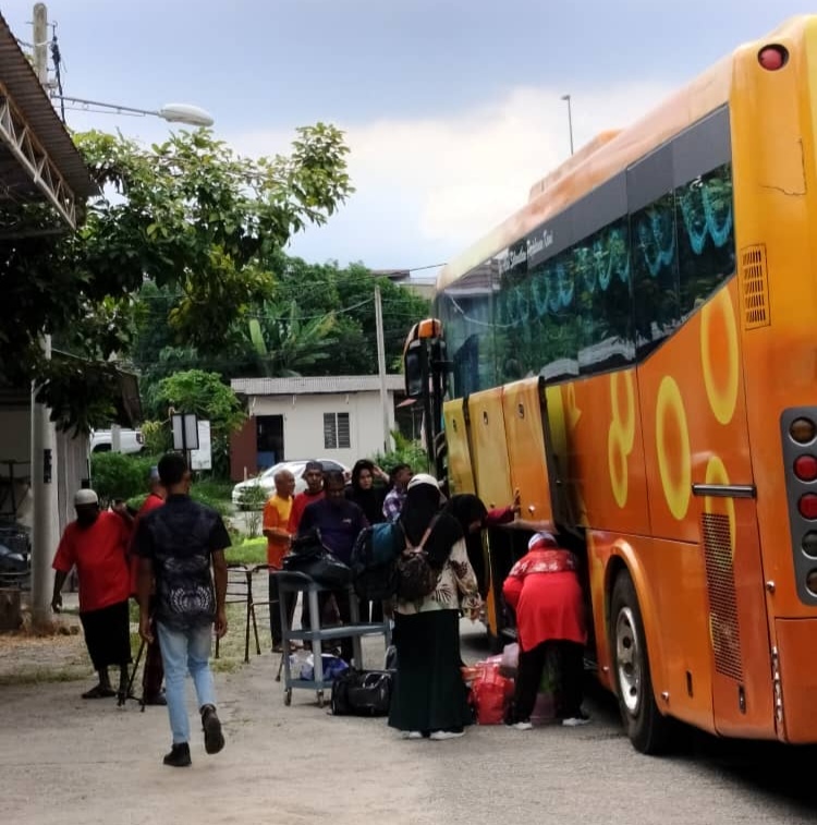 Warga emas yang berkerusi roda dan bertongkat dibantu petugas dan sukarelawan untuk menaiki bas.