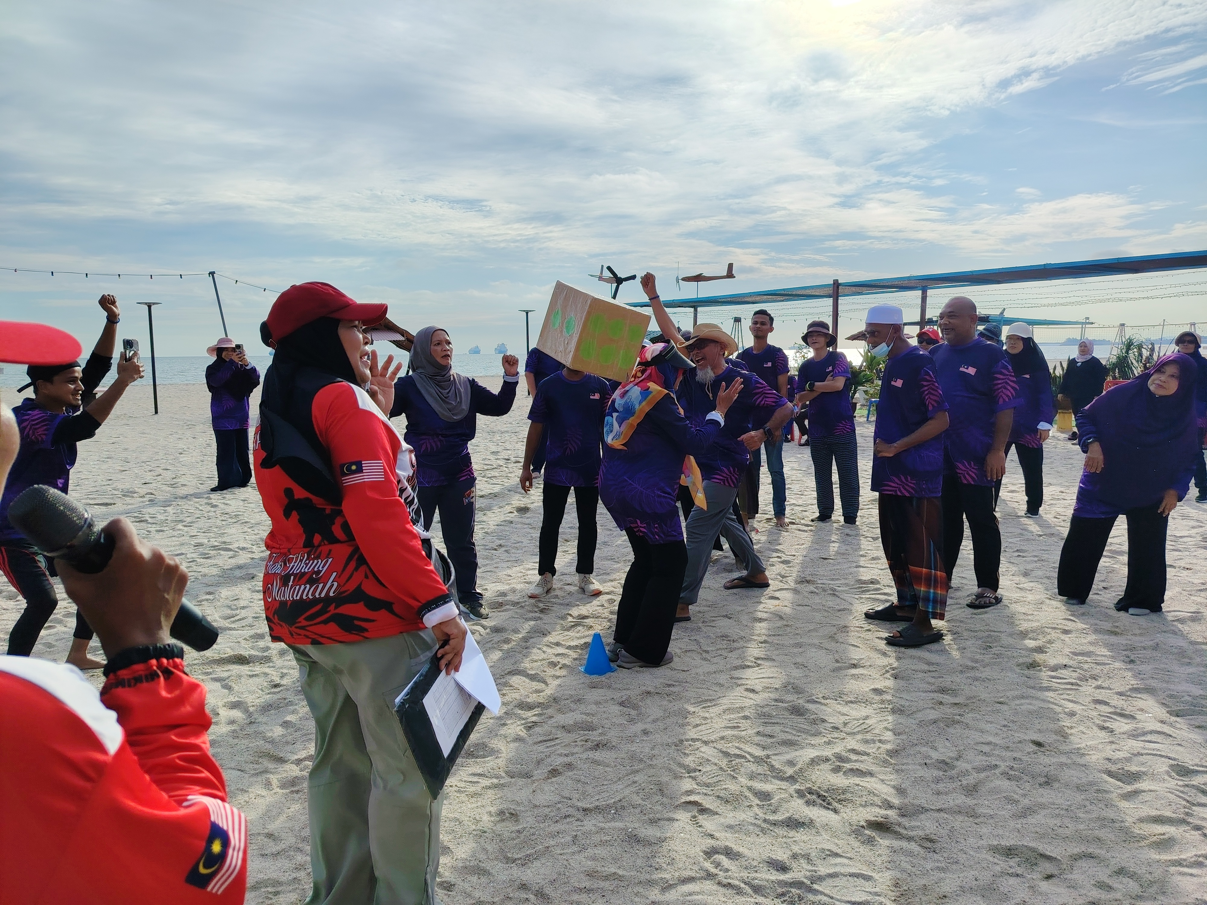 Suasana gamat dalam aktiviti sukaneka membaling kotak dadu yang disertai warga emas, petugas dan sukarelawan.