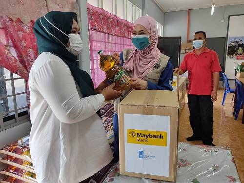 Bertempat di Kompleks Penghulu Mukim Rimba Terjun, Jalan Parit Sulong, Pontian, Johor para penerima menerima bantuan pek makanan menerusi projek 'Covid-19 Immediate Assistance' (Bantuan Segera Covid-19) tajaan Maybank Islamic dengan kerjasama Islamic Relief Malaysia (IRM).