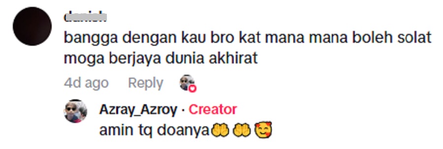Dalam kapsyen ringkas, Azray menulis, “Ramai tanya tempat solat jadi inilah aku tunjuk tempat aku solat.”