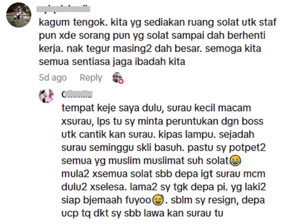 “Kagum tengok. Kita yang sediakan ruang solat untuk staf pun tiada seorang pun yang solat sampai dah berhenti kerja. Nak tegur masing-masing dah besar.