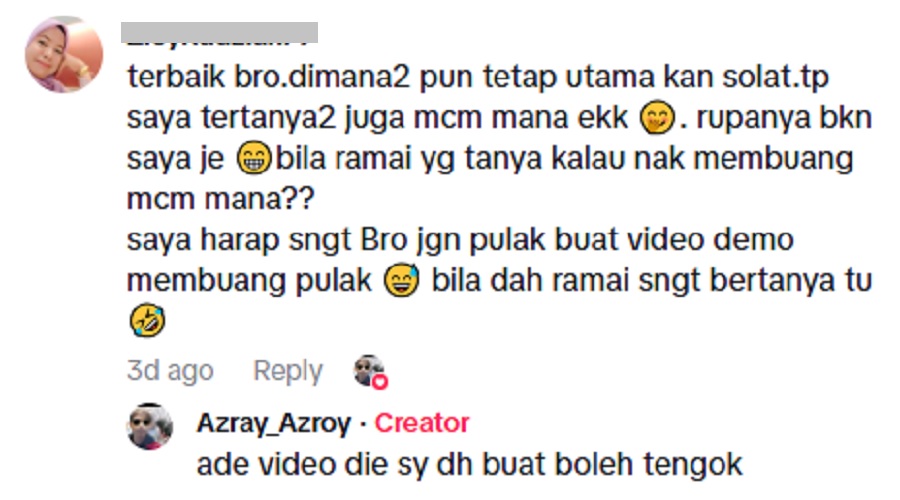 “Terbaik bro, di mana-mana pun tetap utamakan solat. Tapi saya tertanya-tanya juga macam mana ek? Rupa-rupanya bukan saya je apabila ramai yang tanya kalau nak membuang macam mana?