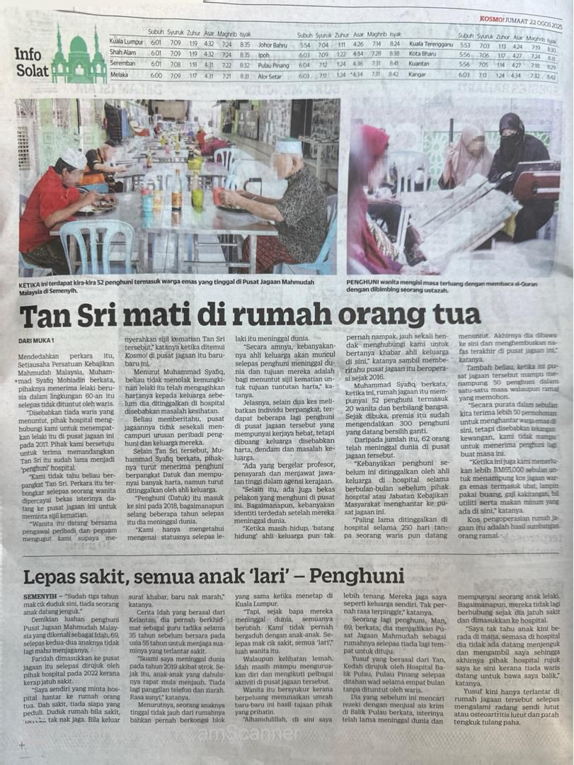 Kisah seorang Tan Sri yang menghabiskan sisa hidup waktu tua di rumah orang-orang tua dan meninggal dunia di rumah penjagaan itu sangat menyedihkan dan memberi banyak pengajaran hidup kepada kita.