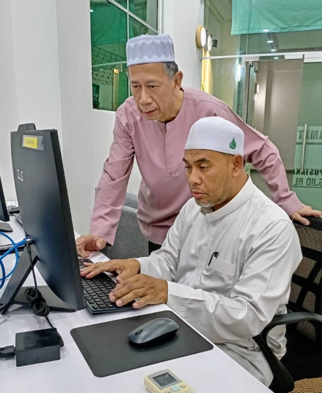 Ustaz Mohd Safian mencuba menggunakan Perpustakaan Digital SIR sambil dibantu oleh seorang AJK Masjid Al-Hasanah untuk mendapatkan bahan bacaan dan rujukan.